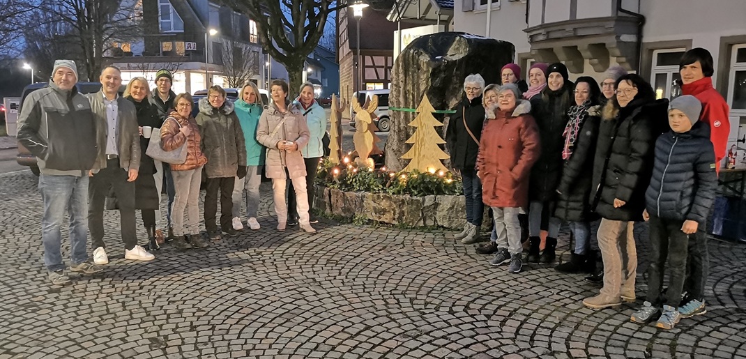 Der Vorsitzende Richard Munz und einige seiner Vorstandskollegen übergaben mehr als 350 Schoko-Weihnachtsmänner an die Erzieherinnen der Kupferzeller Kindergärten für die Kindergartenkinder der Gemeinde. Munz dankte in diesem Zusammenhang den Kupferzeller Landfrauen für das Binden der Girlanden und das Ausschmücken des Marktplatzbrunnens. Die Familie Deitigsmann spendete dafür das nötige Tannenreisig. Mit Unterstützung des Kupferzeller Bauhofs erstrahlt jetzt der Marktplatzbrunnen im weihnachtlichen Glanz. Bei einem kurzen Umtrunk dankte BM Spieles dem Gewerbe- und Handelsverein, den Landfrauen sowie allen anderen Beteiligten für ihre Spenden und ihr Engagement. Der Marktplatzbrunnen ist wieder zu einem echten „Hingucker“ in der vorweihnachtlichen Zeit geworden.